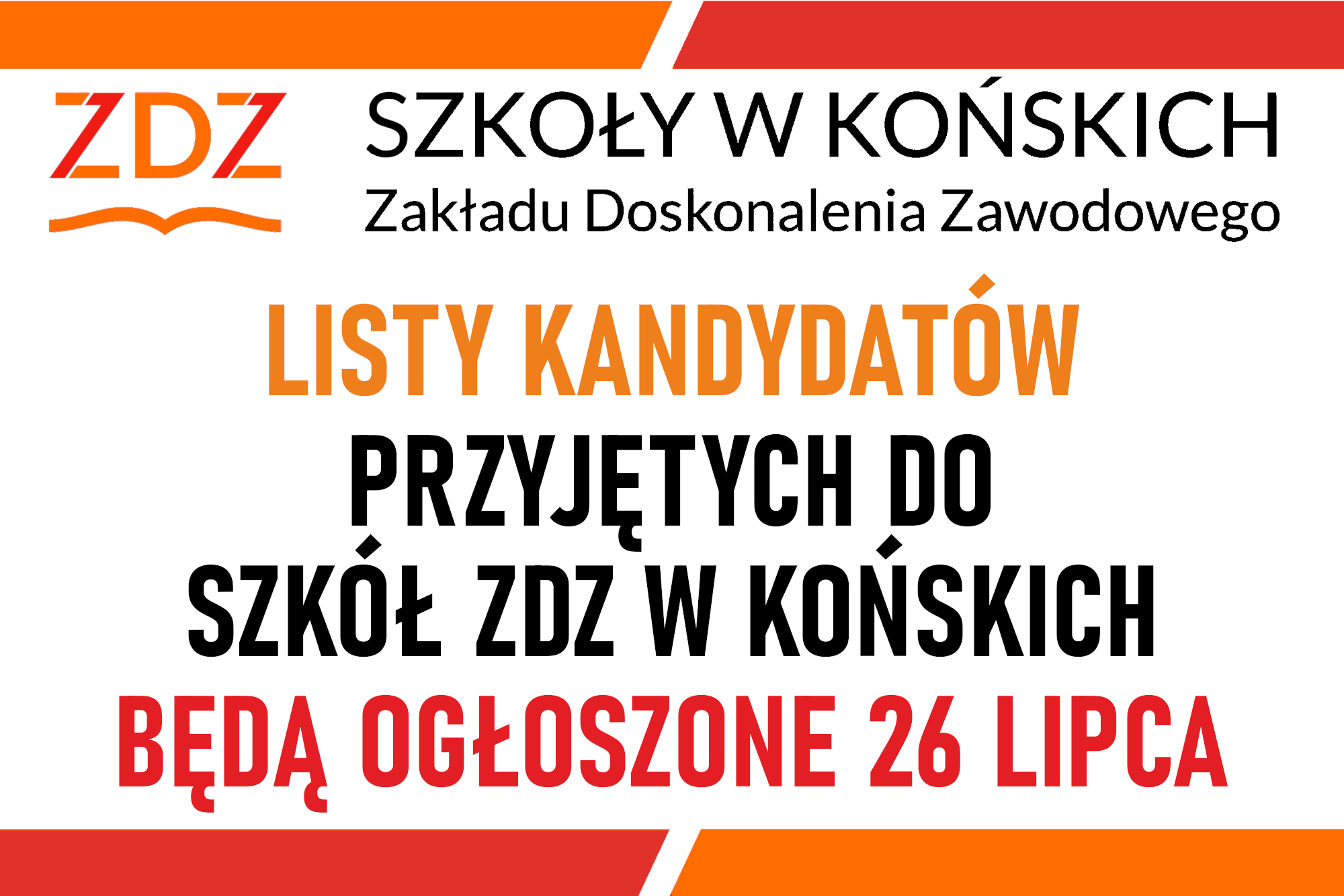 Ogłoszenie listy osób przyjętych do Szkół ZDZ w Końskich na rok szkolny 2025/2026 nastąpi 18.07.2025 r. Lista będzie dostępna w budynku szkoły. Informację o przyjęciu będzie można również uzyskać telefonicznie.